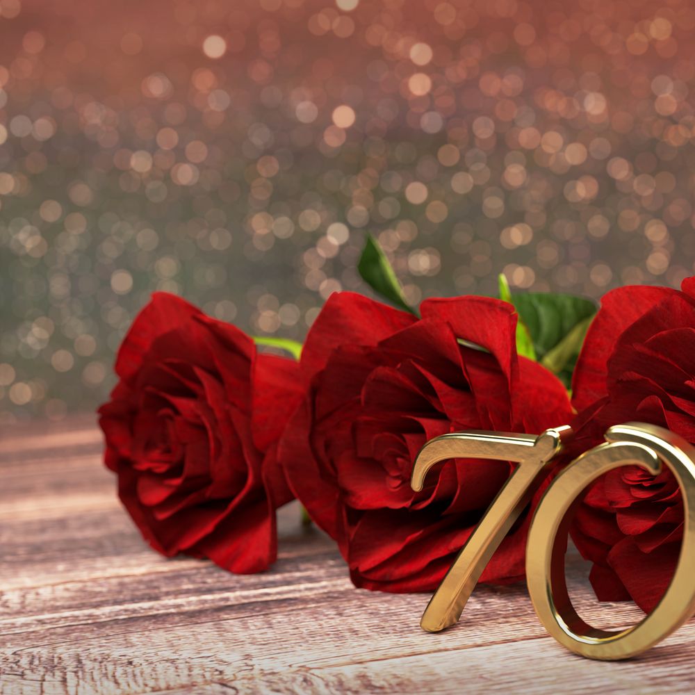 Beautiful red roses and gold 70. Charity birthday ecard to wish an adorable mum, dad, grandma or grandpa happy 70th birthday.