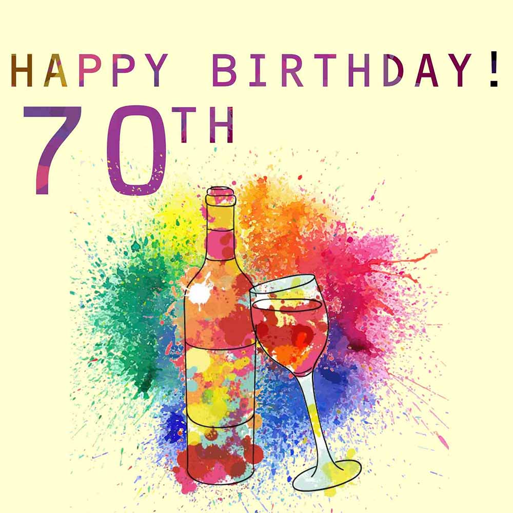 Artistic 70th birthday ecard, colourful painting of birthday wine bottle and glass.