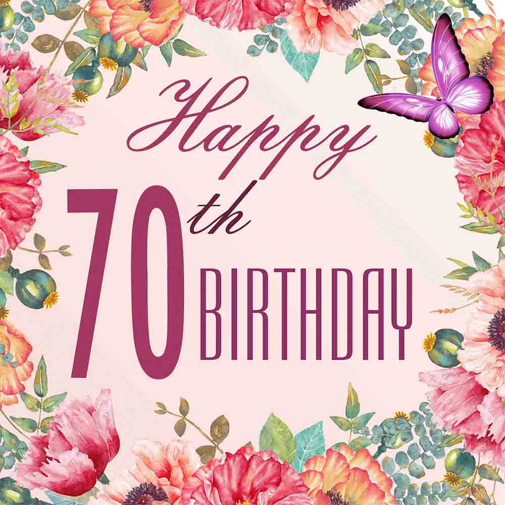 Artistic flower wreath, purple butterfly. Happy 70th birthday charity ecard.