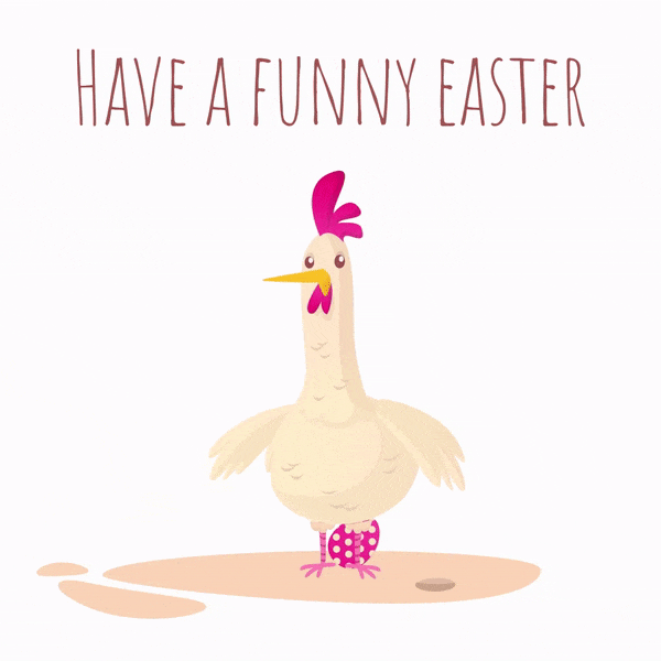 Animated image of a chicken laying an Easter egg, with the caption Have a funny Easter