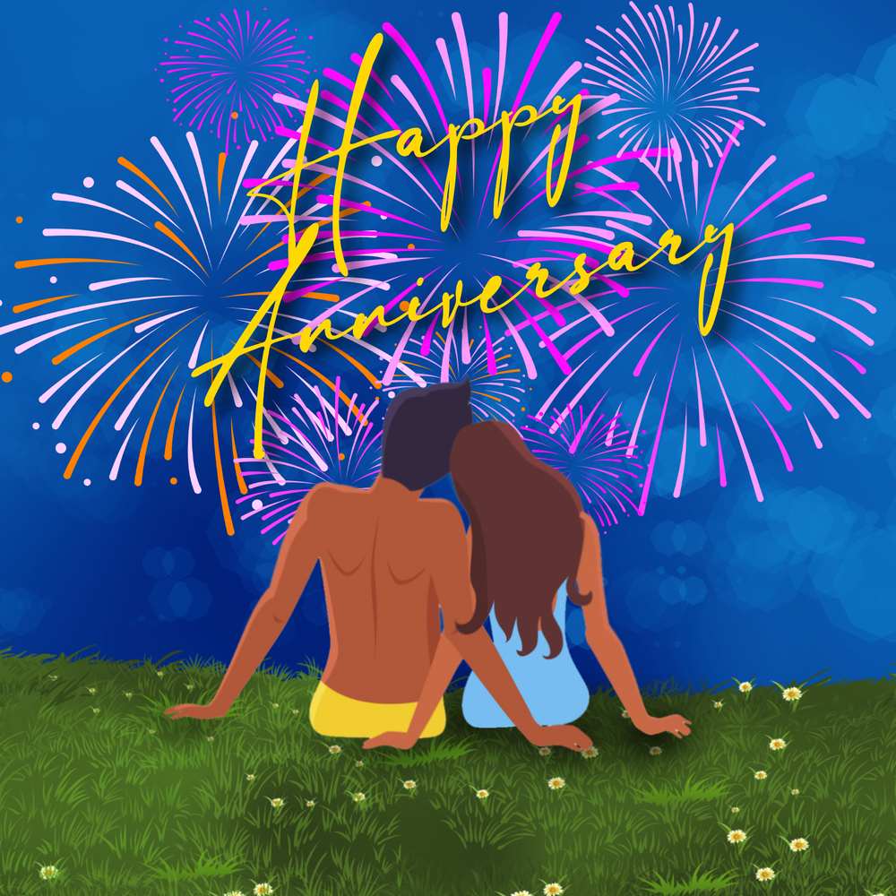 Happy anniversary ecard; couples sitting on a beautiful lawn leaning on each other, staring at a beautiful sky.