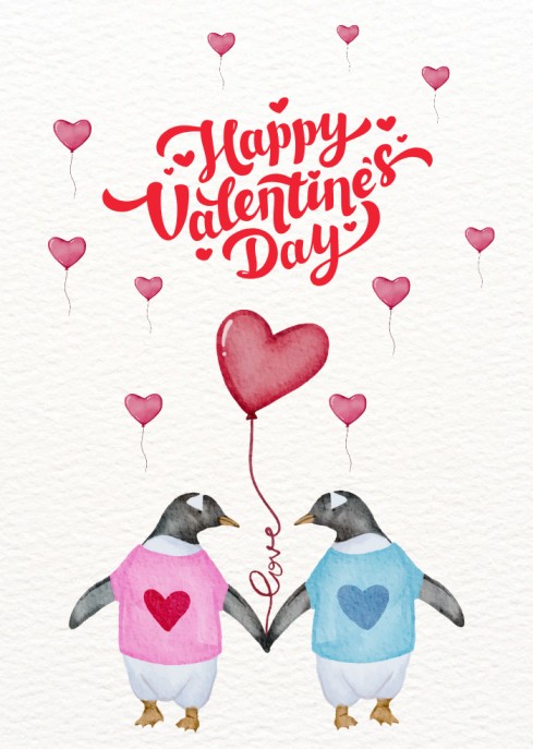 A charming penguin Valentine digital card with animals featuring love balloons and sweet illustrations. This digital card is perfect for romantic, cute, and heartfelt Valentine messages.