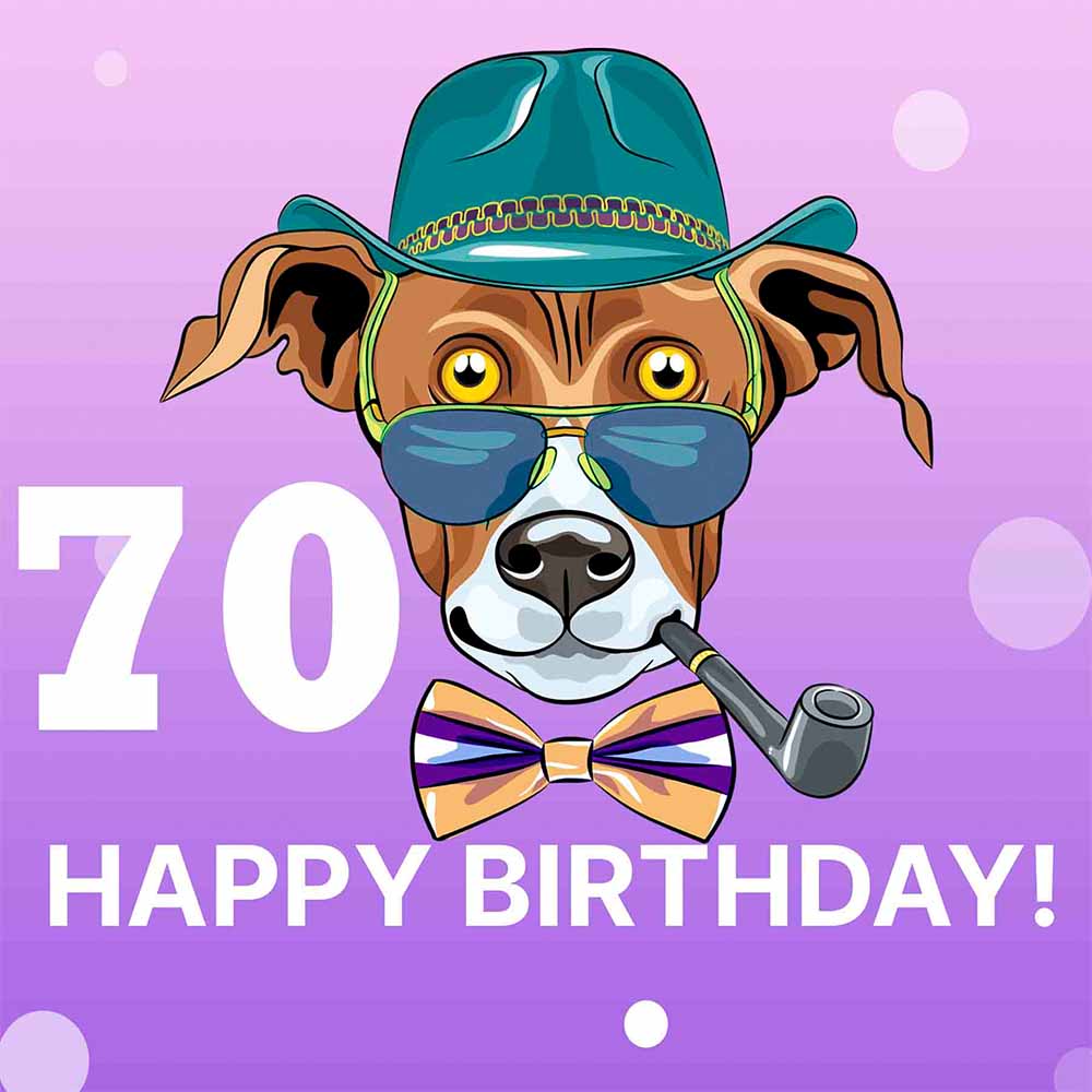 Grandpa 70th birthday ecard; Dog wearing hat, glasses, bow tie and smoking pipe.
